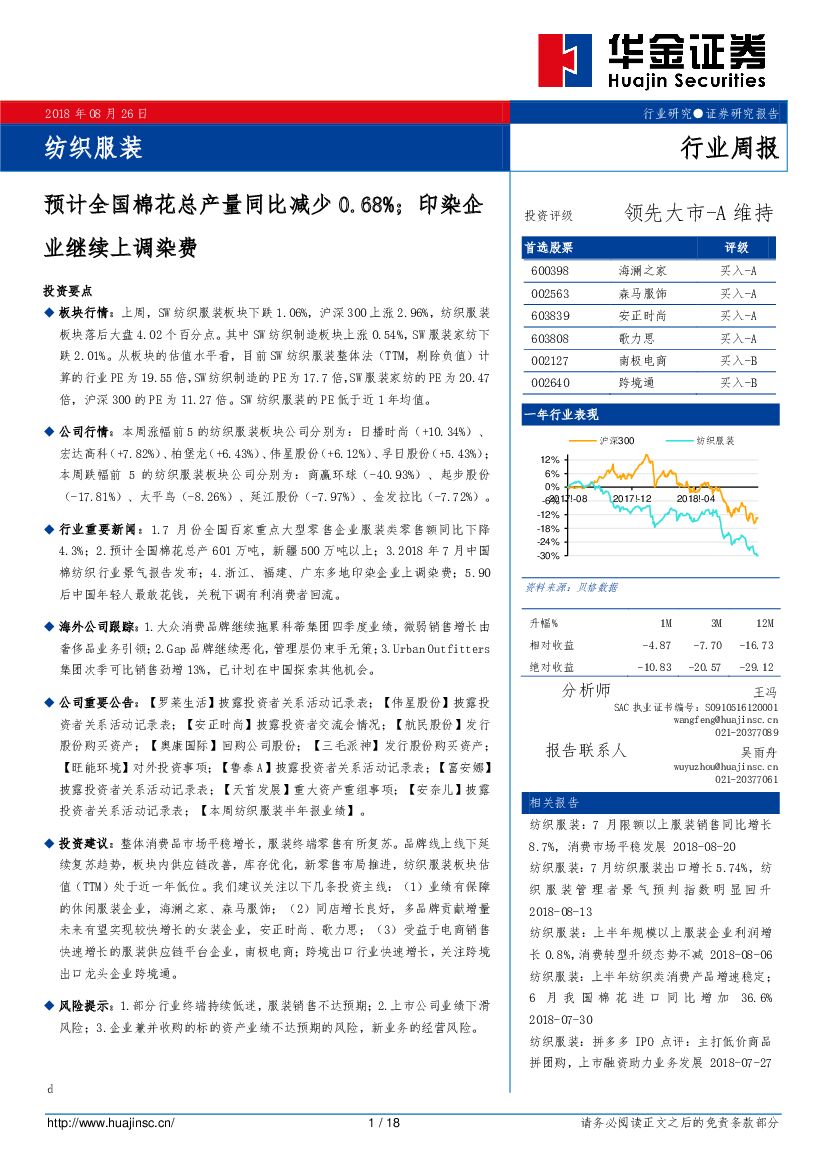 华金证券:纺织服装行业周报:预计全国棉花总产量同比减少0.68%,印染企业继续上调染费.pdf