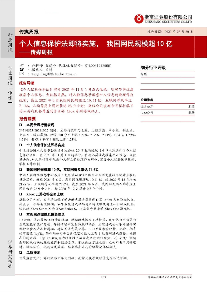 浙商证券:传媒周报:个人信息保护法即将实施,我国网民规模超10亿.pdf