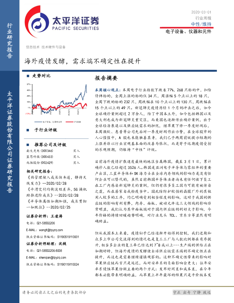 太平洋证券:电子设备、仪器和元件:海外疫情发酵,需求端不确定性在提升.pdf