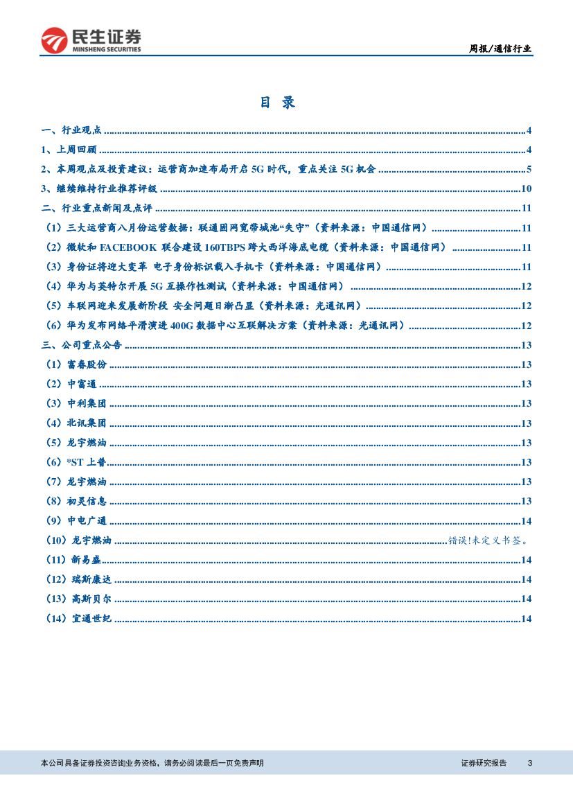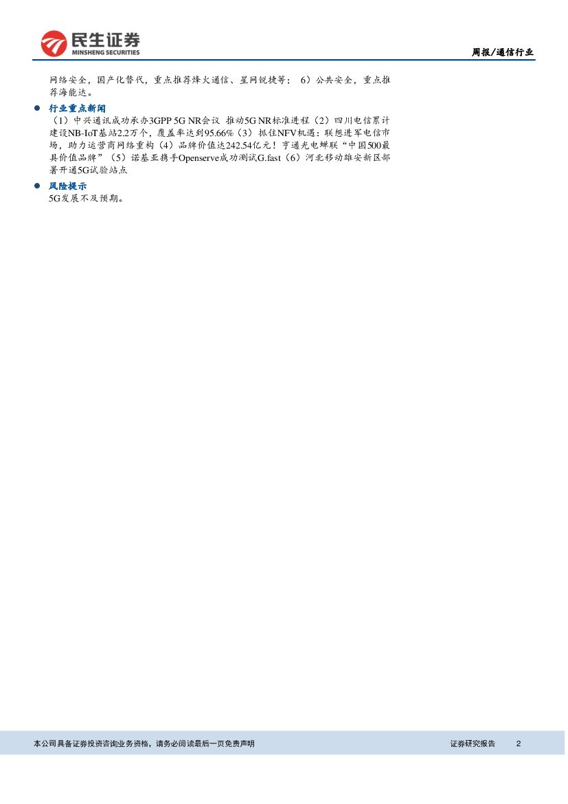 民生证券:通信行业周报:运营商加速布局开启5G时代,重点关注5G机会.pdf