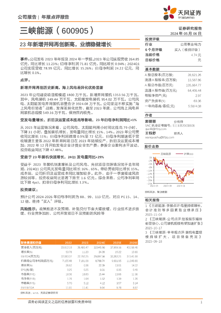 天风证券:三峡能源(600905)-23年新增并网再创新高,业绩稳健增长.pdf