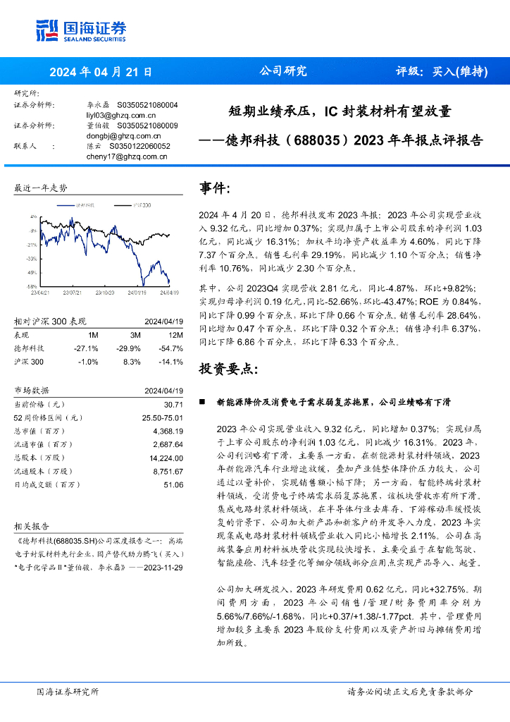 国海证券:德邦科技(688035)-2023年年报点评报告:短期业绩承压,IC封装材料有望放量.pdf