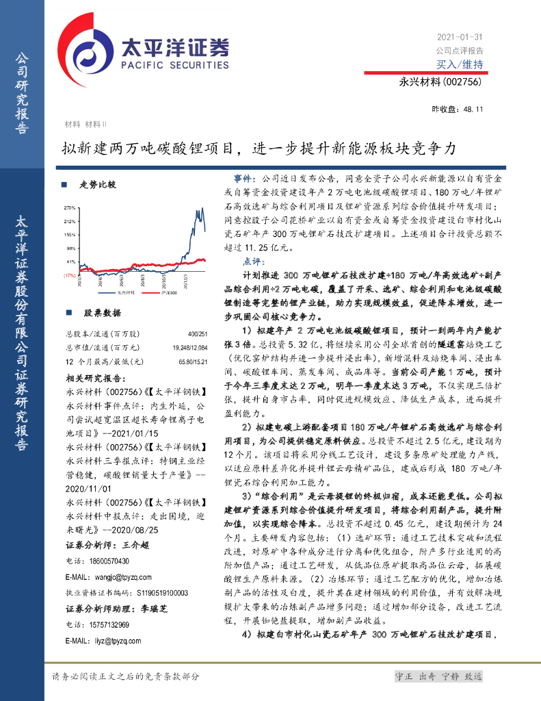 太平洋证券:永兴材料(002756)-拟新建两万吨碳酸锂项目,进一步提升新能源板块竞争力.pdf
