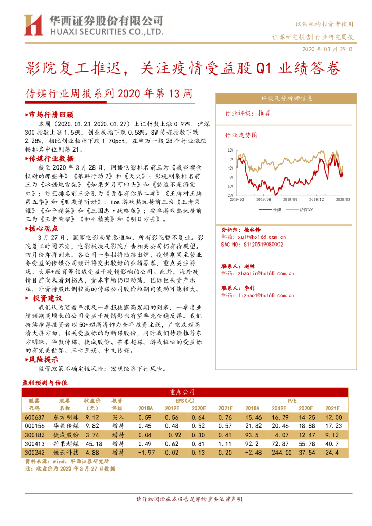 华西证券:传媒行业周报系列2020年第13周:影院复工推迟,关注疫情受益股Q1业绩答卷.pdf