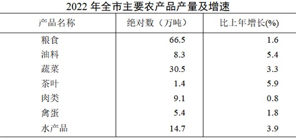 全年粮食产量66.5万吨,比上年增长1.6%;油料产量8.3万吨,增长5.4%;棉花产量0.08万吨,下降25.3%;蔬菜产量30.5万吨,增长3.3%;茶叶产量1.4万吨,增长5.9%;肉类总产量9.1万吨,增长0.8%;禽蛋产量5.4万吨,增长1.8%;水产品产量14.7万吨,增长3.9%。