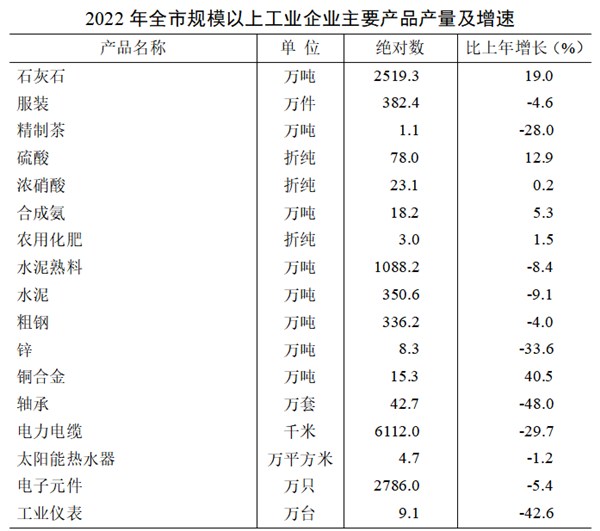 规模以上工业统计的主要产品中,石灰石、硫酸、铜合金、合成氨产量分别增长19%、12.9%、40.5%、5.3%,水泥、粗钢分别下降9.1%、4%。