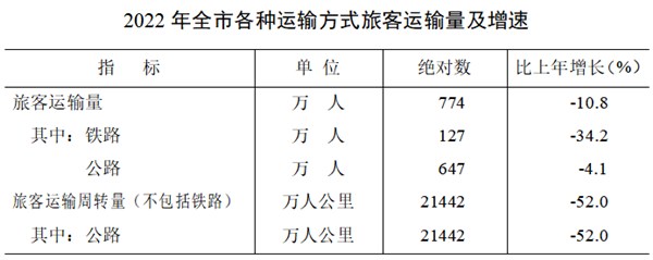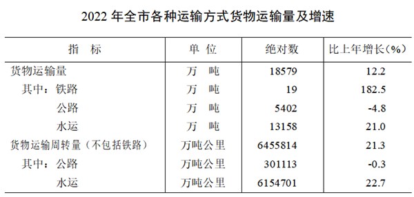 全年旅客运输量774万人,比上年下降10.8%;货物运输量18579万吨,增长12.2%。旅客运输周转量(不包括铁路)21442万人公里,下降52%;货物运输周转量(不包括铁路)6455814万吨公里,增长21.3%。全年港口货物吞吐量13063万吨,增长3.7%,其中外贸货物吞吐量21.3万吨,增长0.2%。港口集装箱吞吐量12422标准箱(TEU),增长0.3%。