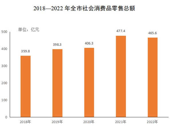 全年社会消费品零售总额465.6亿元,比上年下降2.5%。按经营地统计,城镇消费品零售额356.9亿元,下降2.5%;乡村消费品零售额108.7亿元,下降2.2%。按消费类型统计,商品零售403.4亿元,下降2.4%;餐饮收入62.2亿元,下降2.8%。