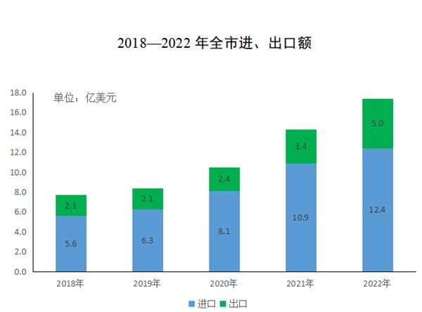 全年进出口总额17.3亿美元,比上年增长20.4%。其中,出口5亿美元,增长44.4%;进口12.4亿美元,增长12.9%。从出口商品看,机电产品出口0.8亿美元,高新技术产品出口1亿美元。全年进出口超亿美元企业4户,超千万美元企业14户。对“一带一路”地区进出口3.5亿美元,增长62.9%,占全市进出口总额的20.2%。对欧洲、RCEP成员国两大新兴市场进出口分别为1.5亿美元、2.6亿美元,合计占全市进出口总额的23.7%。