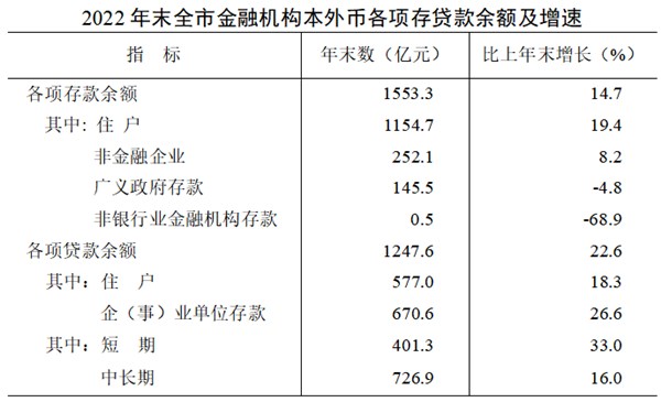 年末全市金融机构本外币各项存款余额1553.3亿元,比上年增长14.7%,比年初增加198.5亿元。其中,住户存款余额1154.7亿元,增长19.4%;非金融企业存款余额252.1亿元,增长8.2%。金融机构本外币各项贷款余额1247.6亿元,增长22.6%,比年初增加230.1亿元。其中,短期贷款余额401.3亿元,增长33%,中长期贷款余额726.9亿元,增长16%。年末全市金融机构外币存款余额4287万美元,比上年增长0.9%,比年初增加37万美元;外币贷款余额2673万美元,比上年下降18.8%,比年初减少621万美元。