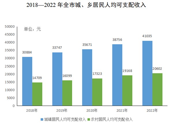 全年常住居民人均可支配收入30964元,比上年增长6.9%。居民人均消费支出17912元,增长3.9%。居民恩格尔系数为33.2%。按常住地分,城镇居民人均可支配收入41035元,比上年增长5.9%;城镇居民人均消费支出20377元,增长4.9%;城镇常住居民恩格尔系数为33.1%。农村居民人均可支配收入20602元,比上年增长7.5%;人均消费支出15376元,增长0.7%;农村常住居民恩格尔系数为33.4%。