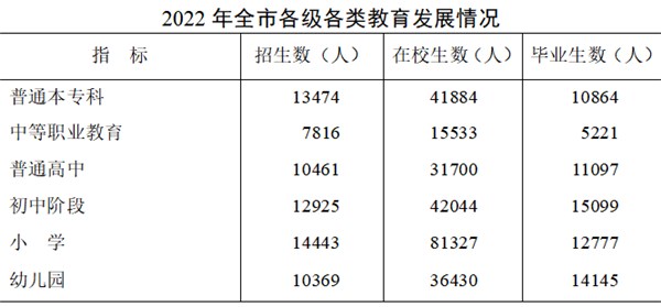 年末全市共有普通高等教育学校3所,普通本专科在校学生41884人,成人在校学生11028人。中等职业教育学校6所,在校学生15533人。普通中学99所,在校学生73744人。其中,高中在校学生31700人,高中阶段毛入学率98.89%;初中在校学生42044人,初中学龄人口毛入学率107.83%。小学154所,在校学生81327人,小学毛入学率103.01%。