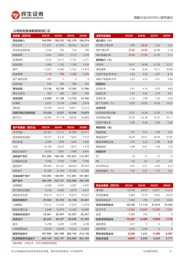 民生证券:海螺水泥(600585)-2024年三季报点评:Q3业绩符合预期,紧跟水泥供需两端积极变化.pdf
