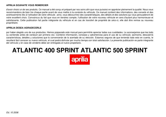 aprilia 8181096 ATLANTIC 400 SPRINT- ATLANTIC 500 SPRINT F-E MY 2006 使用手册.pdf
