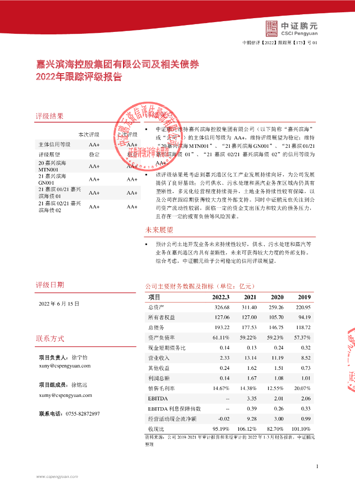 鹏元:嘉兴滨海控股集团有限公司及相关债券2022年跟踪评级报告.pdf
