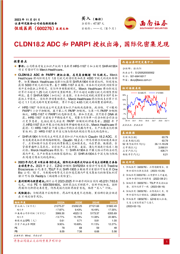 西南证券:恒瑞医药(600276)-CLDN18.2 ADC和PARP1授权出海,国际化密集兑现.pdf