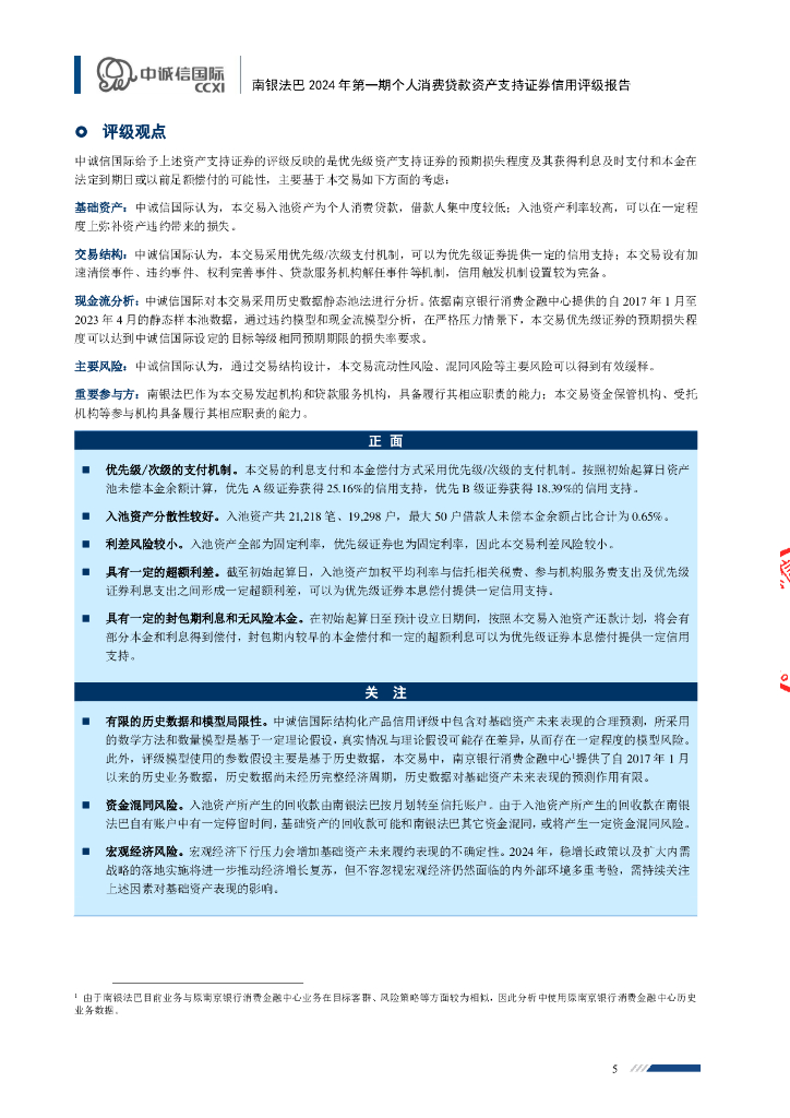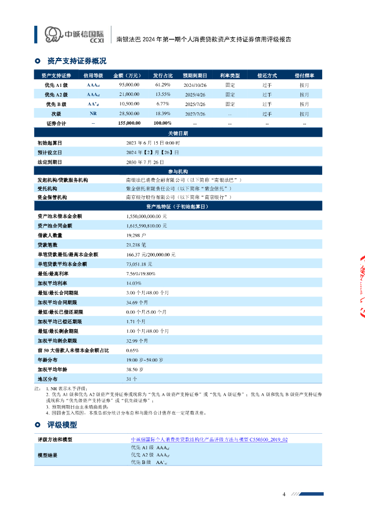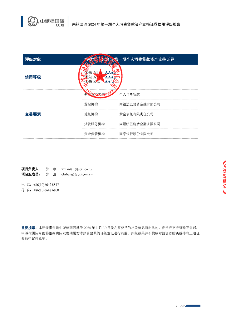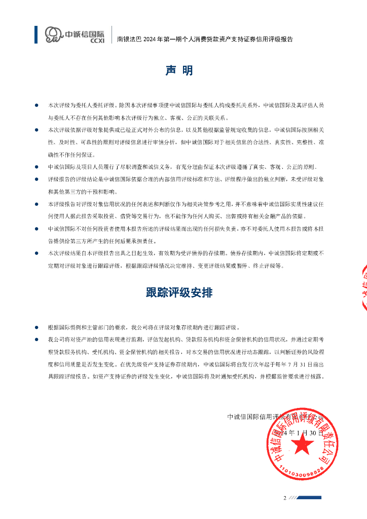 中诚信:南银法巴2024年第一期个人消费贷款资产支持证券信用评级报告及跟踪评级安排(中诚信国际).pdf