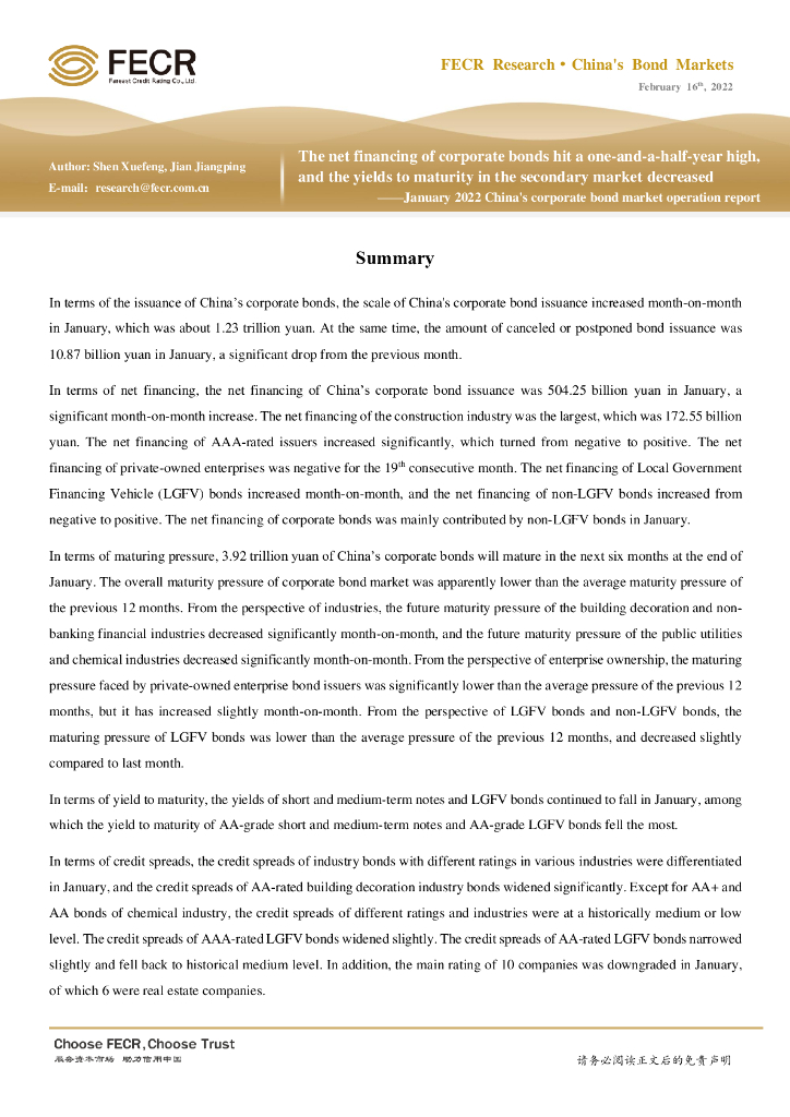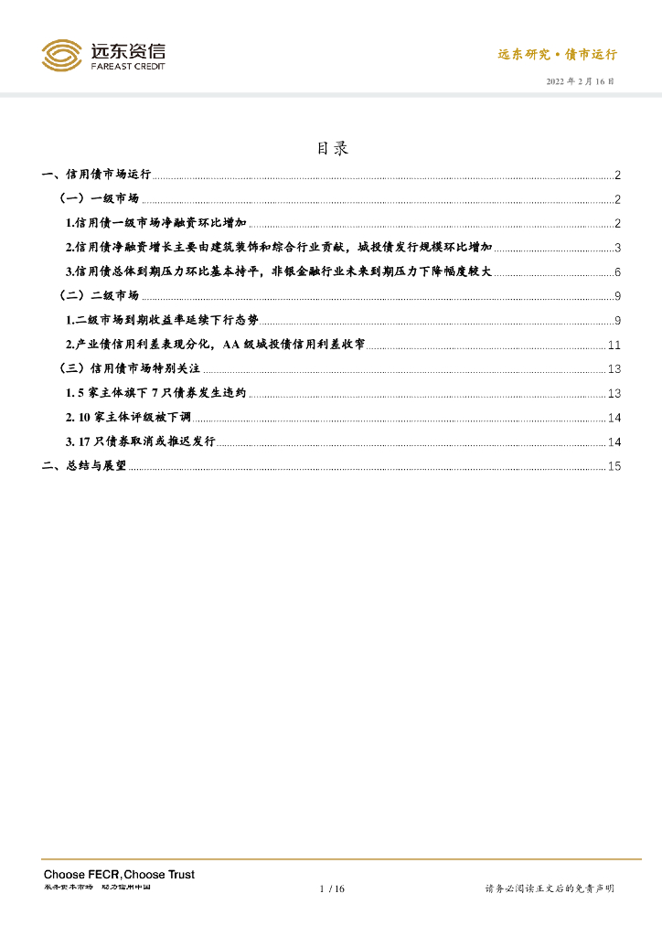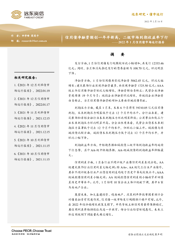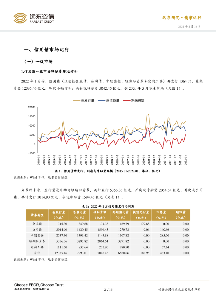 远东资信:2022年1月信用债市场运行报告:信用债净融资额创一年半新高,二级市场到期收益率下行.pdf