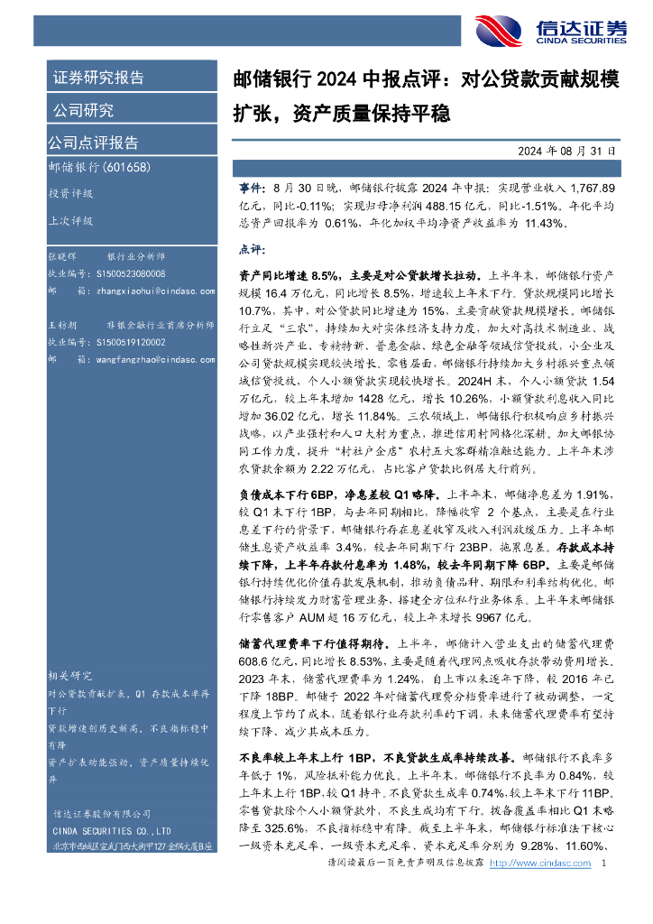信达证券:邮储银行2024中报点评:对公贷款贡献规模扩张,资产质量保持平稳.pdf