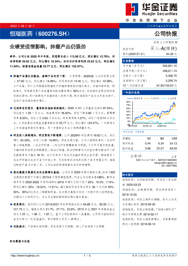 华金证券:恒瑞医药(600276)-业绩受疫情影响,肿瘤产品仍强劲.pdf