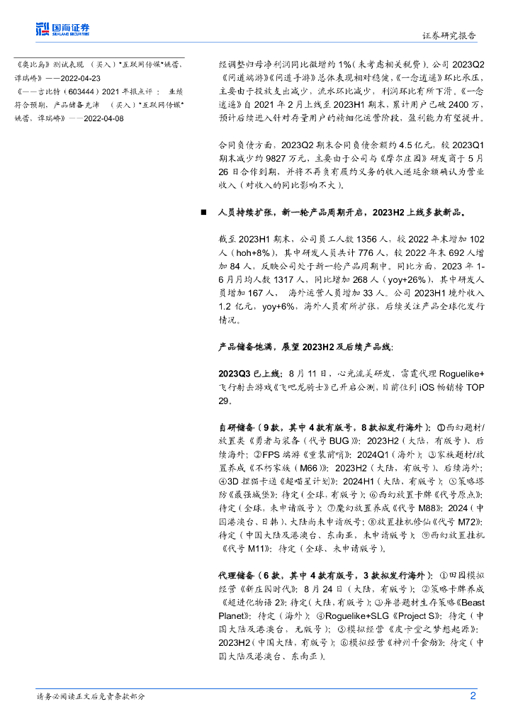 国海证券:吉比特(603444)-2023年半年报点评:业绩好于预期,维持高分红率,新品周期开启.pdf