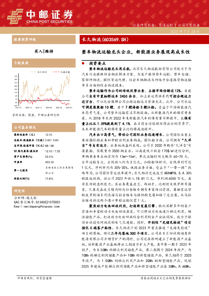 中邮证券:长久物流(603569)-整车物流运输龙头企业,新能源业务展现高成长性.pdf