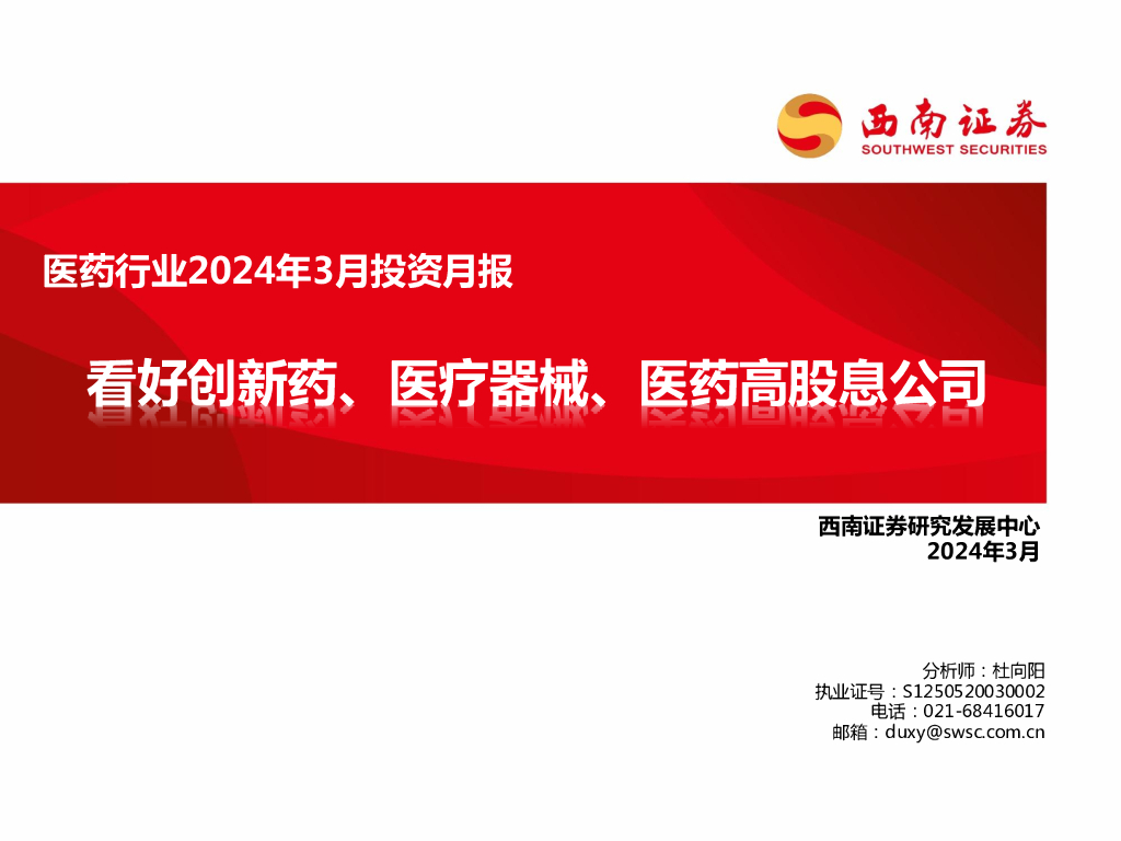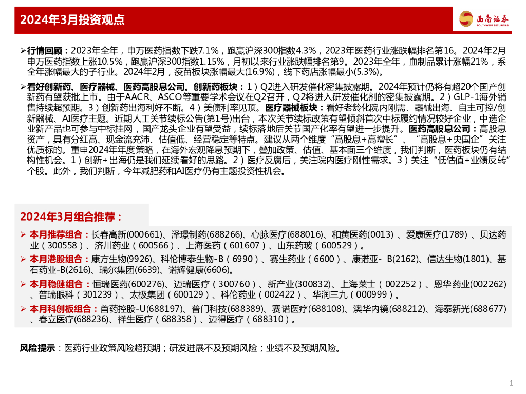 西南证券:医药行业2024年3月投资月报:看好创新药、医疗器械、医药高股息公司.pdf