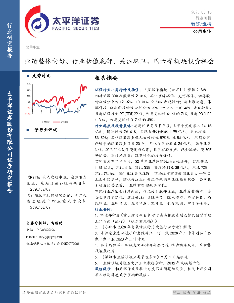 太平洋证券:公用事业行业周报:业绩整体向好、行业估值底部,关注环卫、国六等板块投资机会.pdf