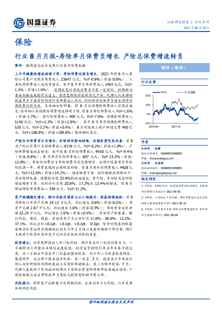 国盛证券:保险行业8月月报:寿险单月保费负增长,产险总保费增速转负.pdf