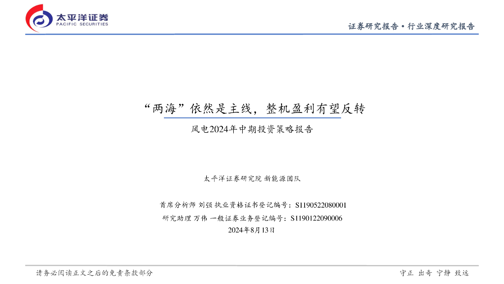 太平洋证券:风电2024年中期投资策略报告:“两海”依然是主线,整机盈利有望反转.pdf