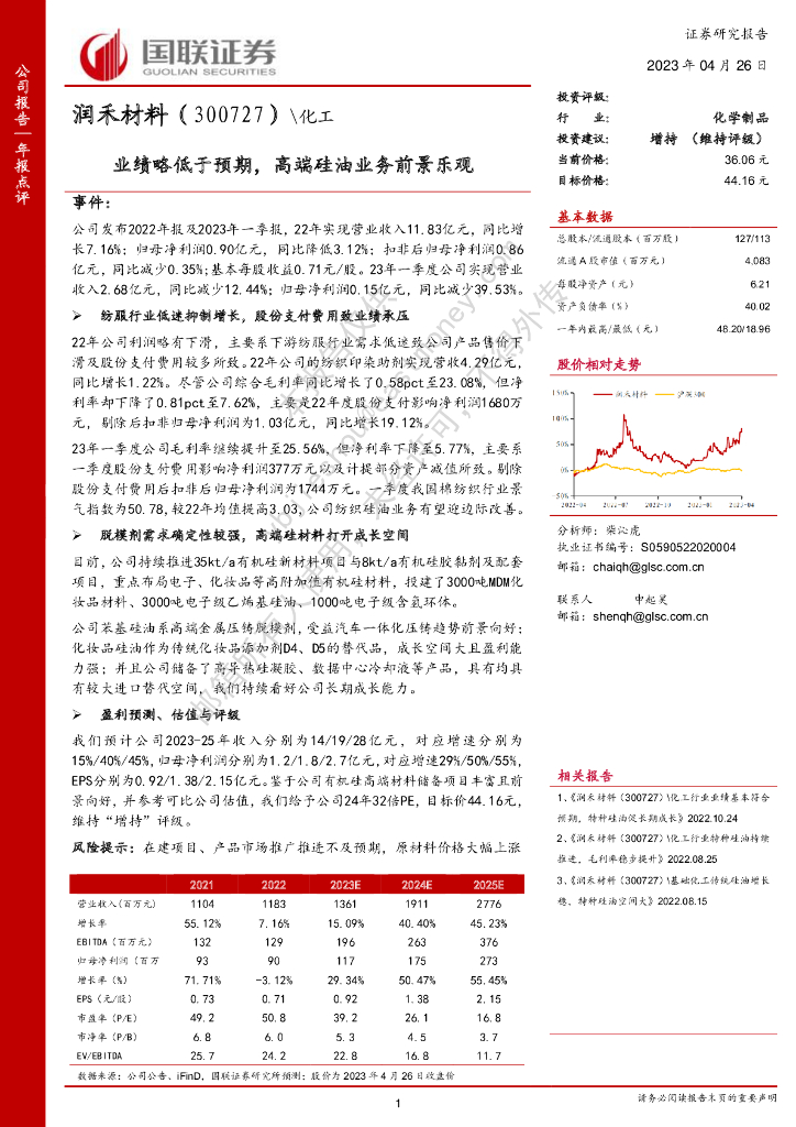国联证券:润禾材料(300727)-业绩略低于预期,高端硅油业务前景乐观.pdf