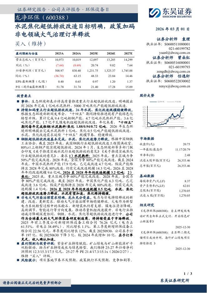 东吴证券:龙净环保(600388)-水泥焦化超低排放改造目标明确,政策加码非电领域大气治理订单释放.pdf