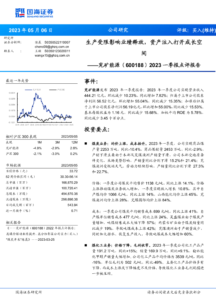 国海证券:兖矿能源(600188)-2023一季报点评报告:生产受限影响业绩释放,资产注入打开成长空间.pdf
