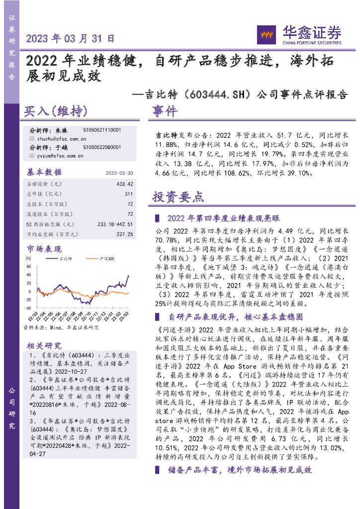 华鑫证券:吉比特(603444)-公司事件点评报告:2022年业绩稳健,自研产品稳步推进,海外拓展初见成效.pdf