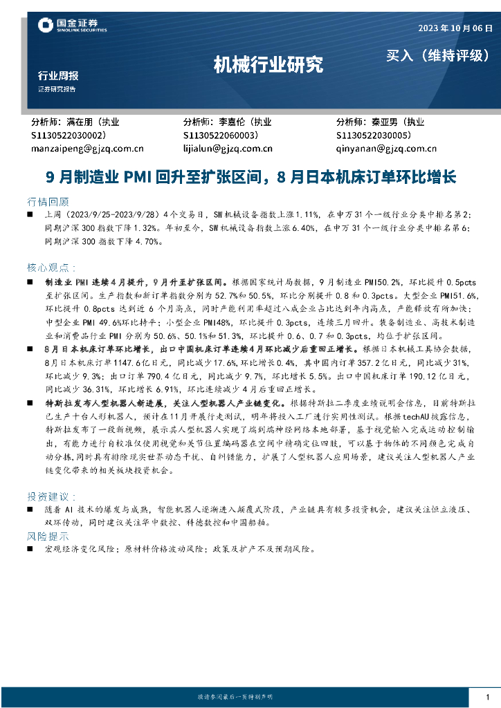 国金证券:机械行业周报:9月制造业PMI回升至扩张区间,8月日本机床订单环比增长.pdf