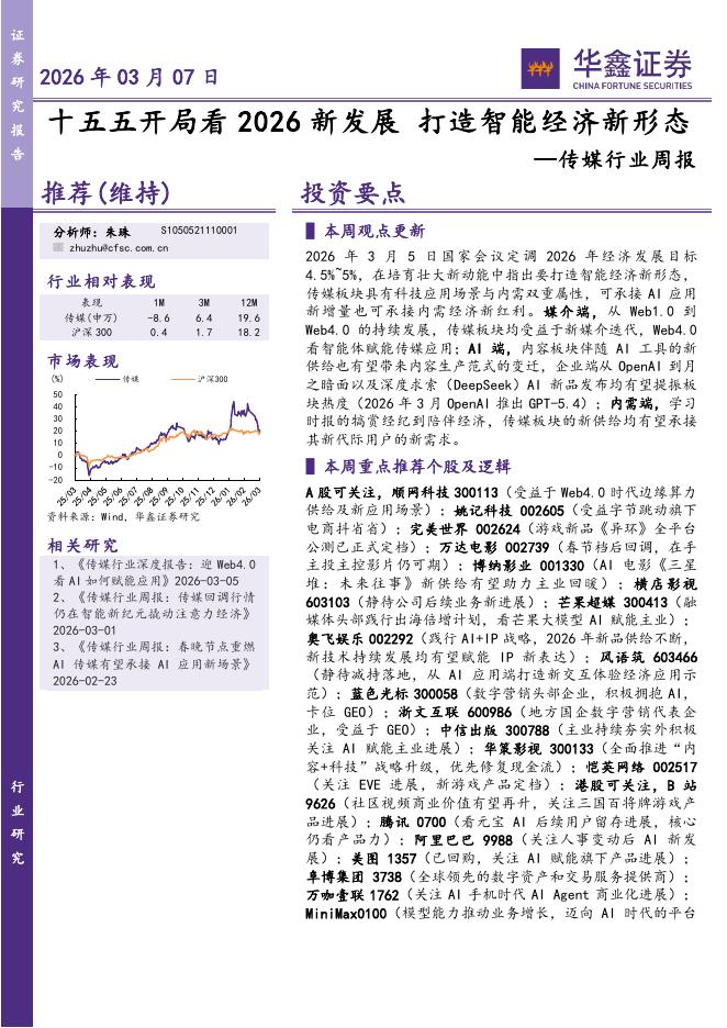 华鑫证券:传媒行业周报:十五五开局看2026新发展,打造智能经济新形态.pdf