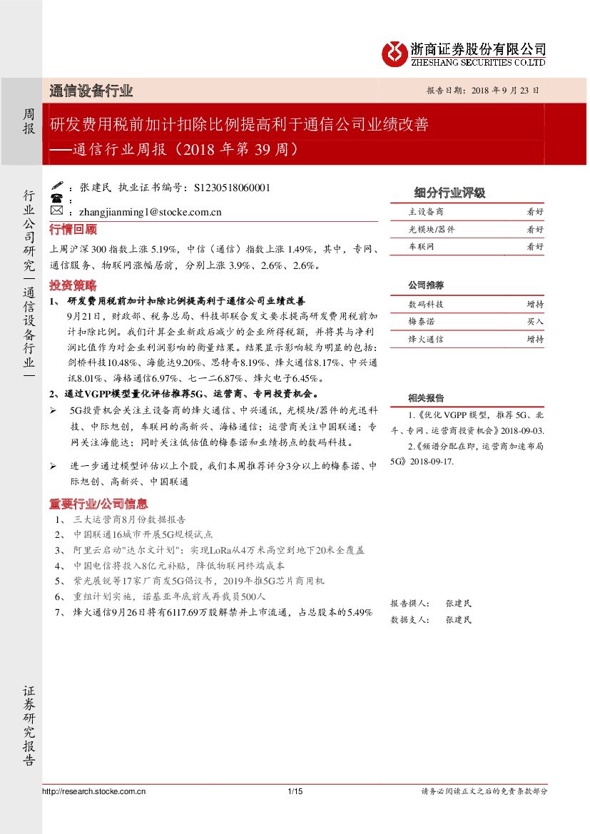 浙商证券:通信行业周报(2018年第39周):研发费用税前加计扣除比例提高利于通信公司业绩改善.pdf