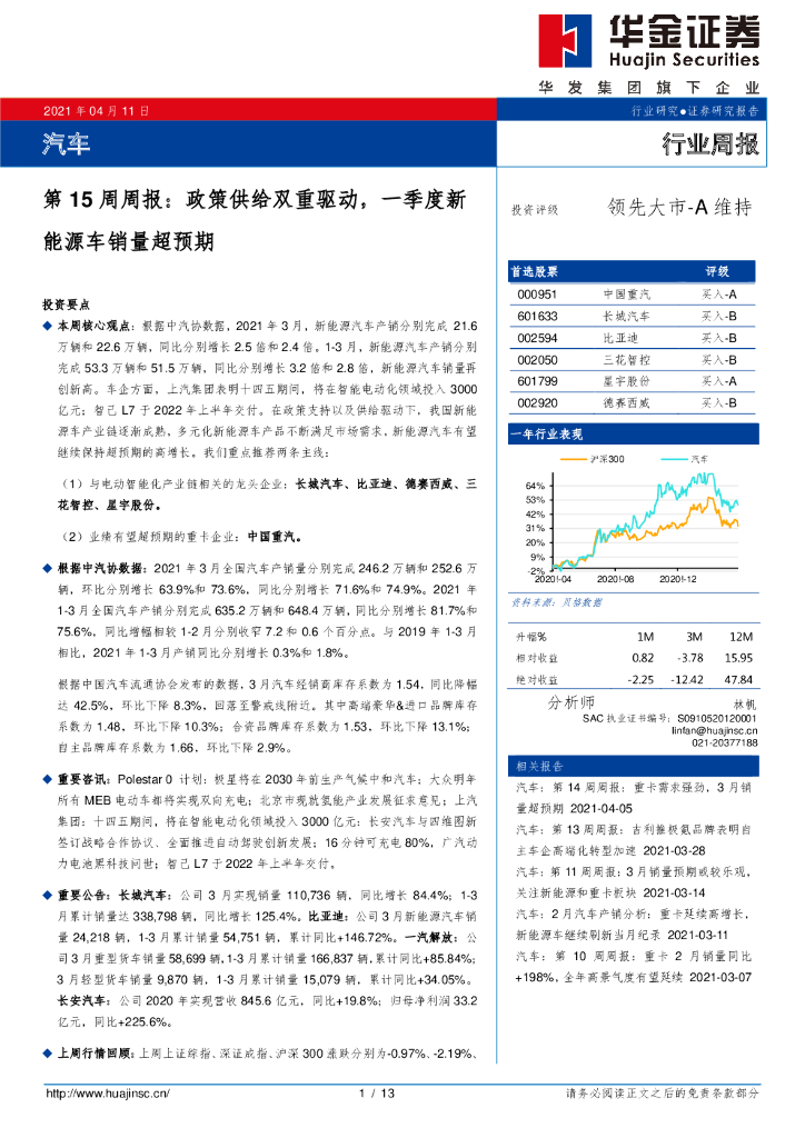 华金证券:汽车行业第15周周报:政策供给双重驱动,一季度新能源车销量超预期.pdf