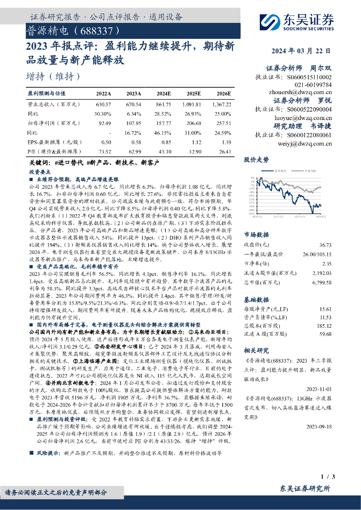 东吴证券:普源精电(688337)-2023年报点评:盈利能力继续提升,期待新品放量与新产能释放.pdf