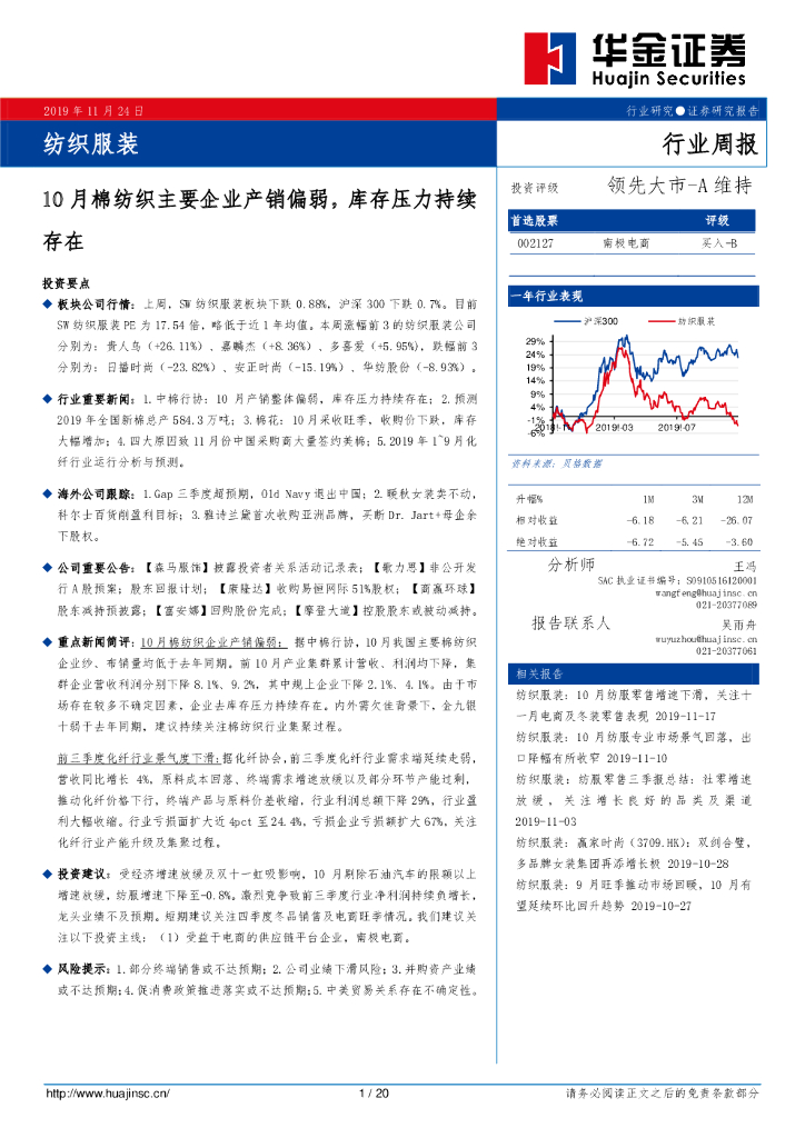 华金证券:纺织服装行业周报:10月棉纺织主要企业产销偏弱,库存压力持续存在.pdf