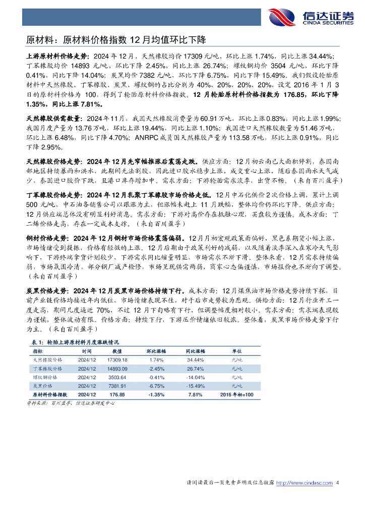 信达证券:轮胎行业专题报告(2024年12月):12月原材料价格指数环比下滑,赛轮拟扩建柬埔寨全钢胎产能.pdf