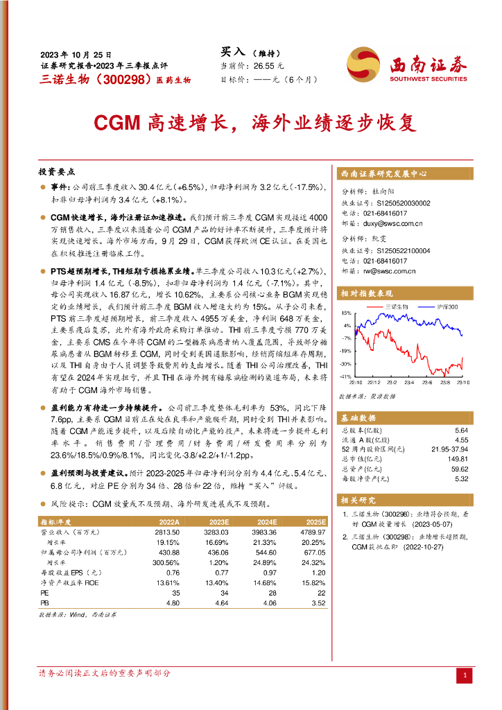 西南证券:三诺生物(300298)-2023年三季报点评:CGM高速增长,海外业绩逐步恢复.pdf