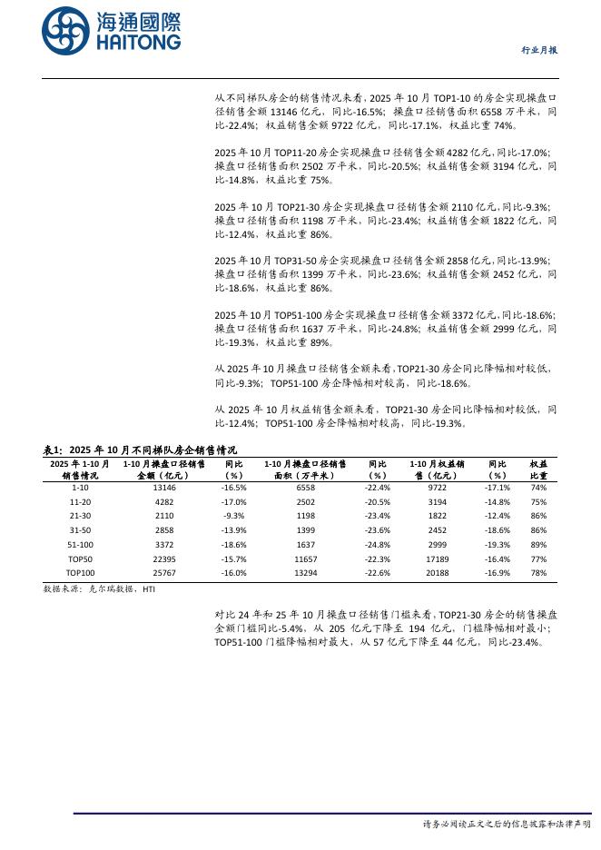 海通国际:TOP100房企2025年10月销售数据点评:单月销售环比微增,“十五五”定调行业高质量发展.pdf