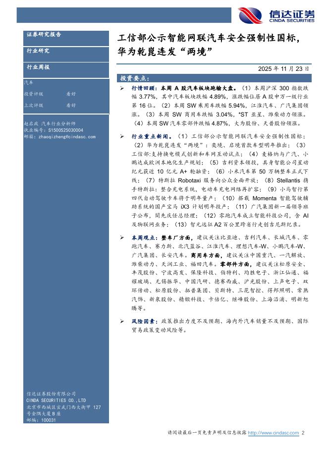 信达证券:汽车行业周报:信部公示智能网联汽车安全强制性国标,华为乾崑连发“两境”.pdf