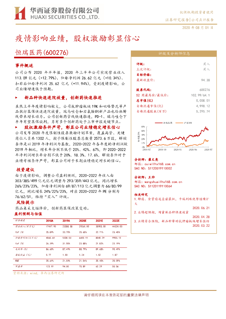 华西证券:恒瑞医药(600276)-疫情影响业绩,股权激励彰显信心.pdf