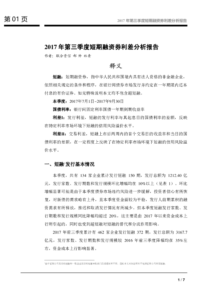 联合资信:2017年第三季度短期融资券利差分析报告.pdf