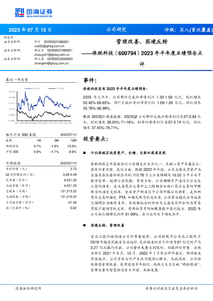 国海证券:保税科技(600794)-2023年半年度业绩预告点评:管理改善,困境反转.pdf