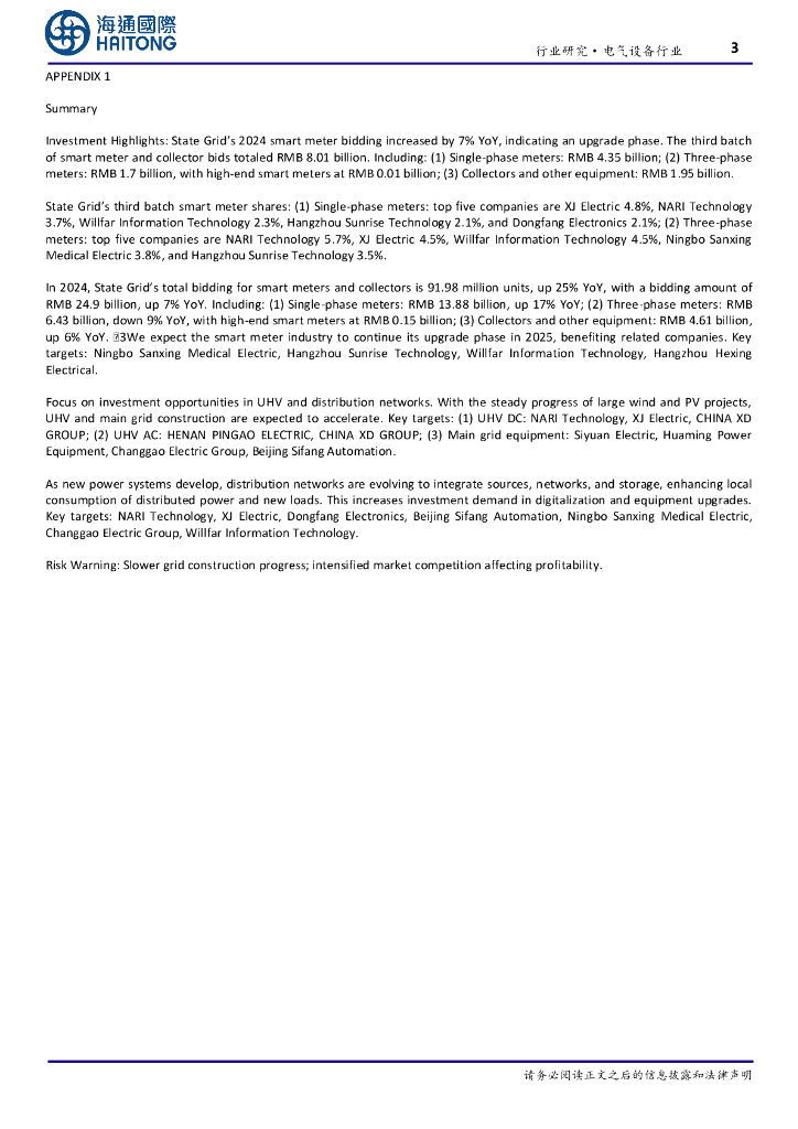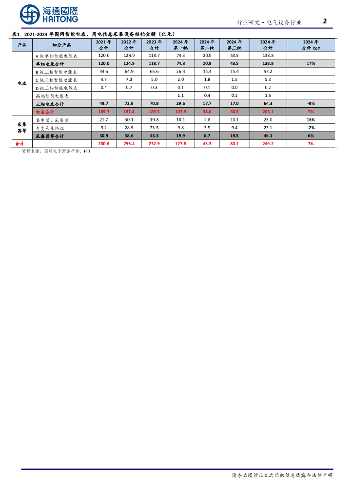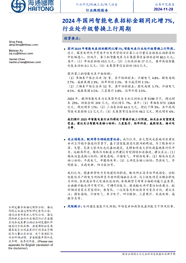 海通国际:电气设备行业跟踪报告:2024年国网智能电表招标金额同比增7%,行业处升级替换上行周期.pdf