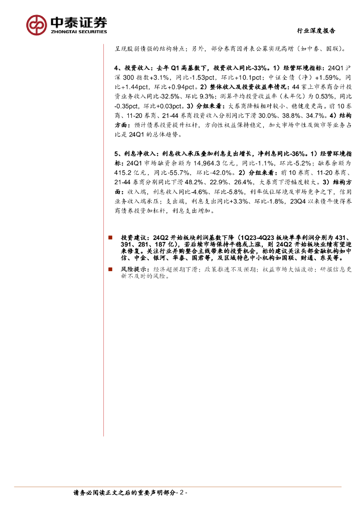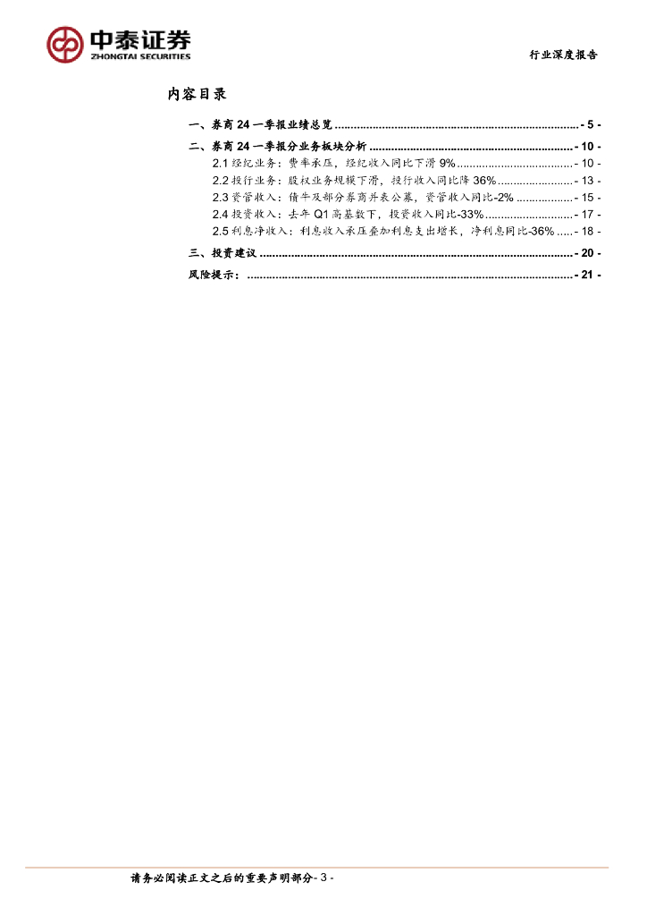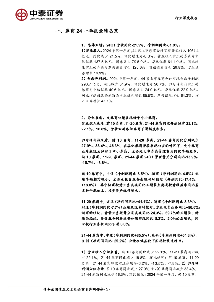 中泰证券:综述与各业务分析|券商24一季报:投行投资净利息承压,高基数下利润下滑三成.pdf