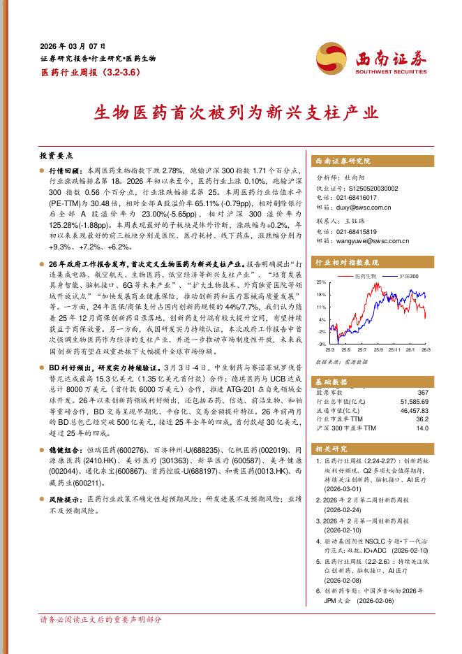 西南证券:医药行业周报:生物医药首次被列为新兴支柱产业.pdf